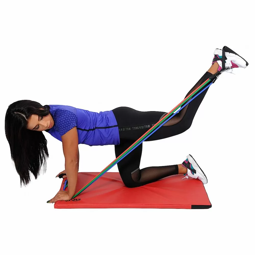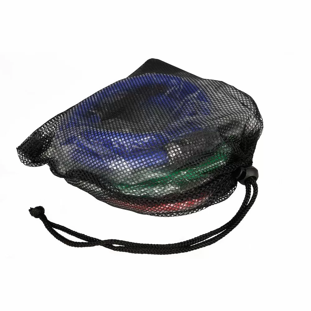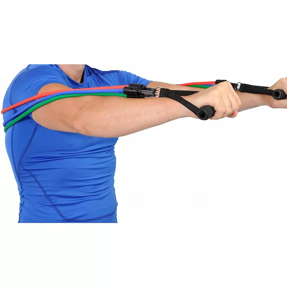 -set sadrzi 3 gume razlicite rastegljivosti (jacine), 2 rucke (rukohvata ) koji se lako kace na odgovarajucu gumu, i platnenu kesu za nosenje