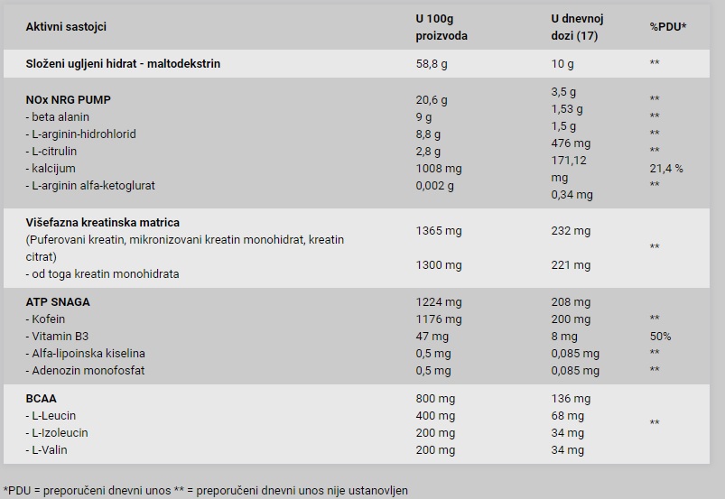Sastojci: maltodekstrin, beta-alanin, L-arginin-hidrohlorid, limunska kiselina, aroma grožđa, L-citrulin, kalcijum trifosfat, sredstvo protiv zgrudvavanja – silicijum dioksid, mikronizovani kreatin monohidrat, kofein, zaslađivač – sukraloza, natrijum hlorid, L-leucin, L-izoleucin, L-valin, nikotinska kiselina, magnezijum oksid, kalcijum citrat, boje – alura crvena AC, indigotin; kalcijum citrat malat, L-arginin alfa ketoglutarat, magnezijum citrat, alfa-lipoinska kiselina, adenozin monofosfat, gvožđe fumarat, gvožđe pirofosfat, cink oksid, piridoksin hidrohlorid, hrom(III)-hlorid.